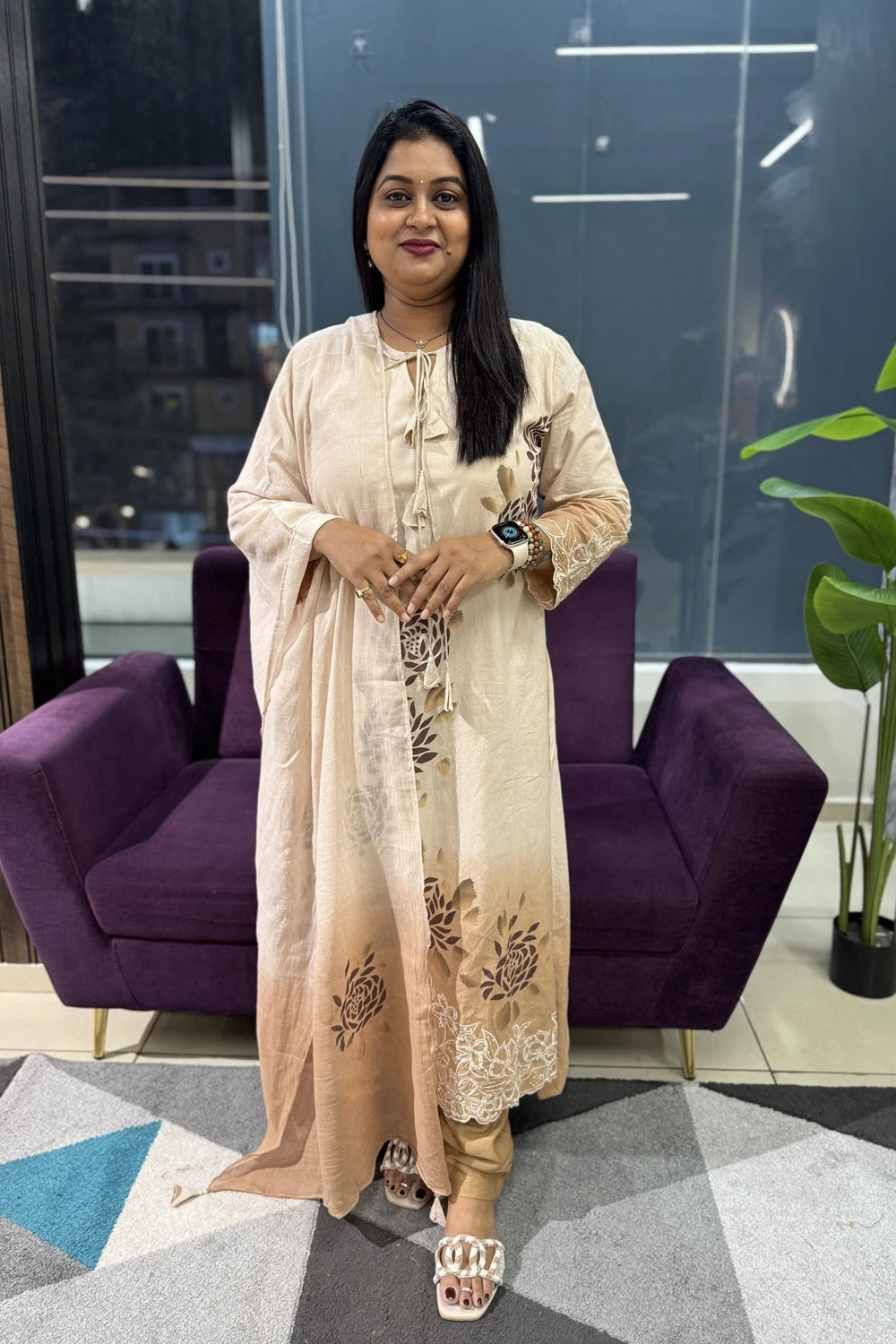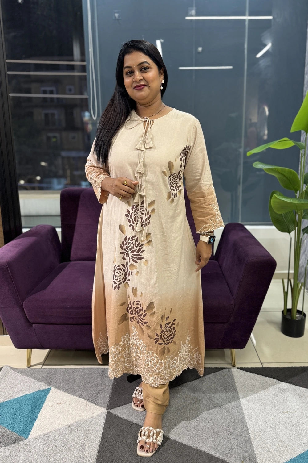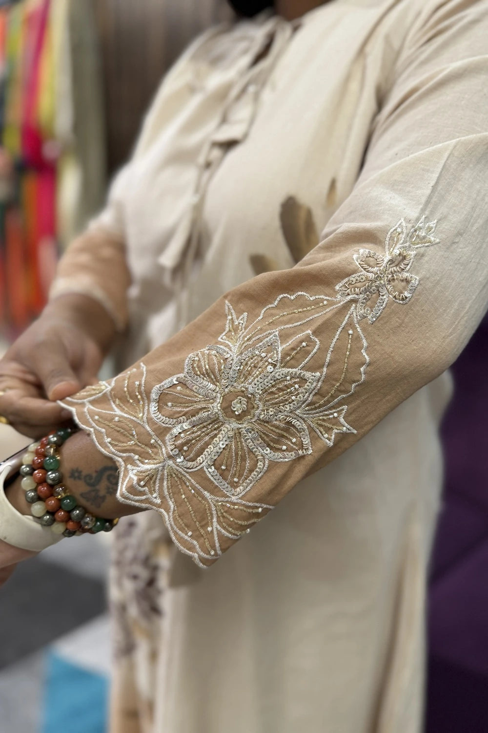 Crafted from premium mulcotton, this beige Anarkali kurta exemplifies refined elegance through meticulous handpainting and artisanal embellishment. The flared silhouette with three-quarter sleeves and internal lining creates a graceful, flattering drape ideal for festive occasions and celebrations. Thoughtfully designed without pockets, the piece maintains its clean aesthetic while the soft, breathable fabric ensures comfort throughout wear. Pair with the included coordinating pant for a complete ensemble. Dry wash recommended to preserve the delicate handwork and vibrant details that give this kurta its distinctive, soulful character.