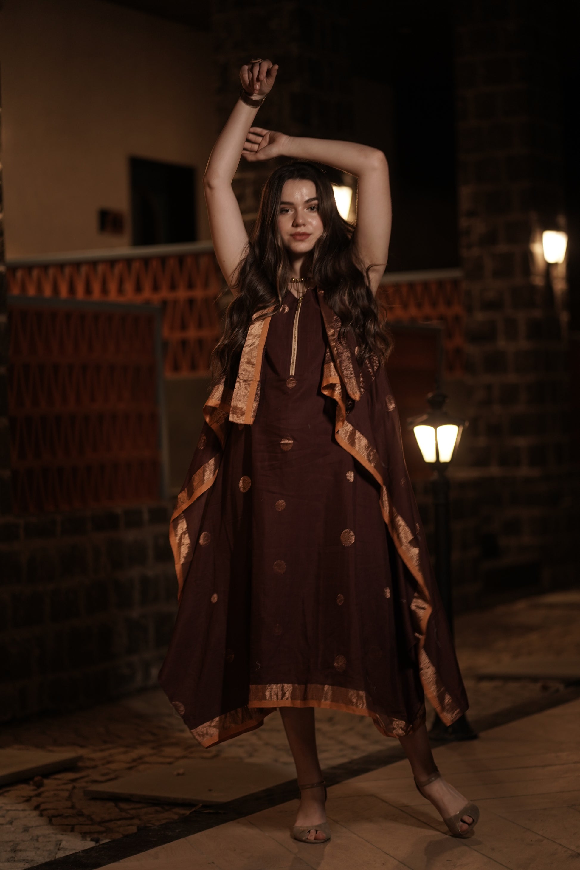Brown Colour Zip Pattern Cowl Type Frock with Jacket