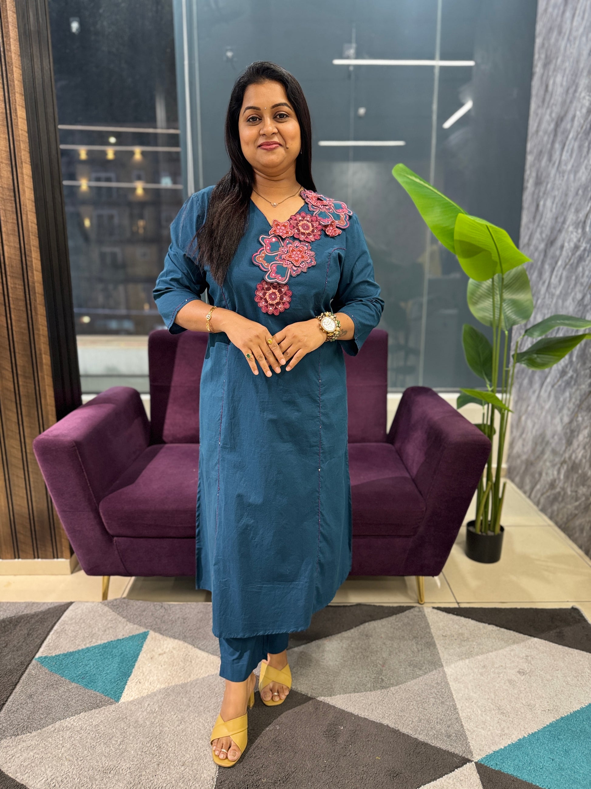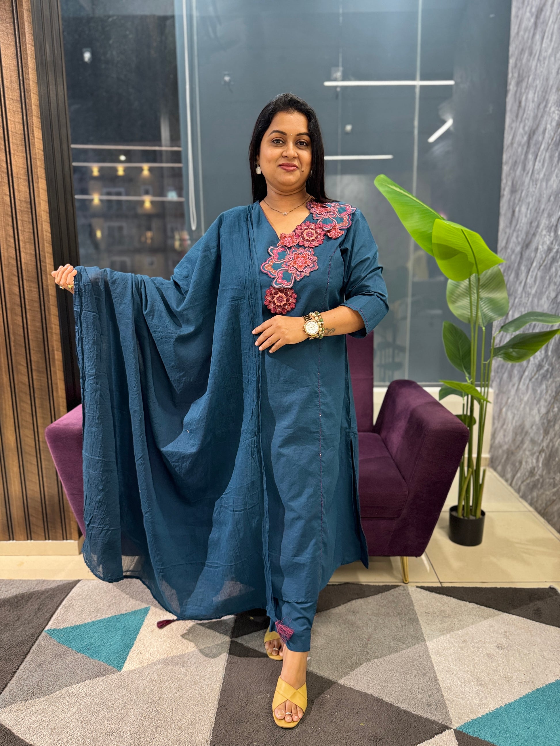 Crafted from exceptionally soft cotton, this suit set features delicate appliqué detailing on the shoulders for understated elegance. The ensemble includes a coordinating crush cotton dupatta that adds texture and dimension. Designed for versatile wear—from office settings to casual occasions—this straight-fit piece offers comfort through its regular fit silhouette and three-quarter sleeves. The unlined construction enhances breathability, while the included pants complete the coordinated look. Hand wash recommended to preserve the fabric's softness and appliqué work.