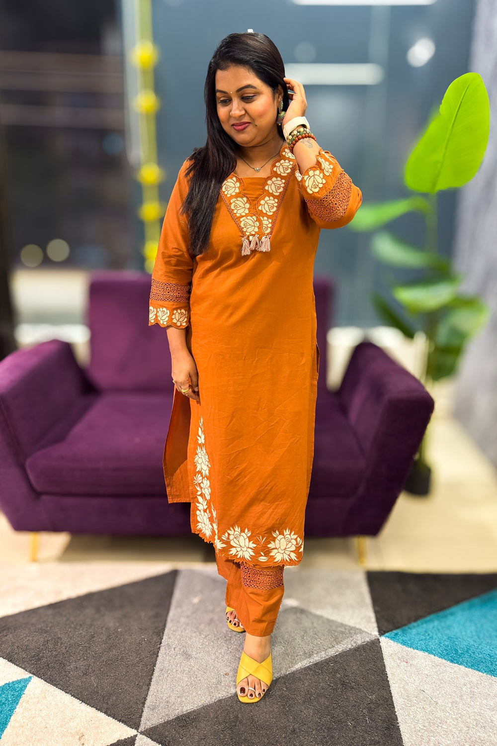 Elevate your office wardrobe with this sophisticated cotton suit set, crafted from premium cotton fabric for breathable comfort throughout the day. Featuring subtle embroidery and thoughtful patch detailing, this ensemble strikes the perfect balance between professional and contemporary. Available in elegant lilac, rich maroon, and warm mustard, the straight-fit silhouette flatters all body types while the three-quarter sleeves offer a modern touch. Paired with comfortable palazzo pants, this versatile set transitions seamlessly from boardroom meetings to casual gatherings, making it an essential addition to your work wardrobe.