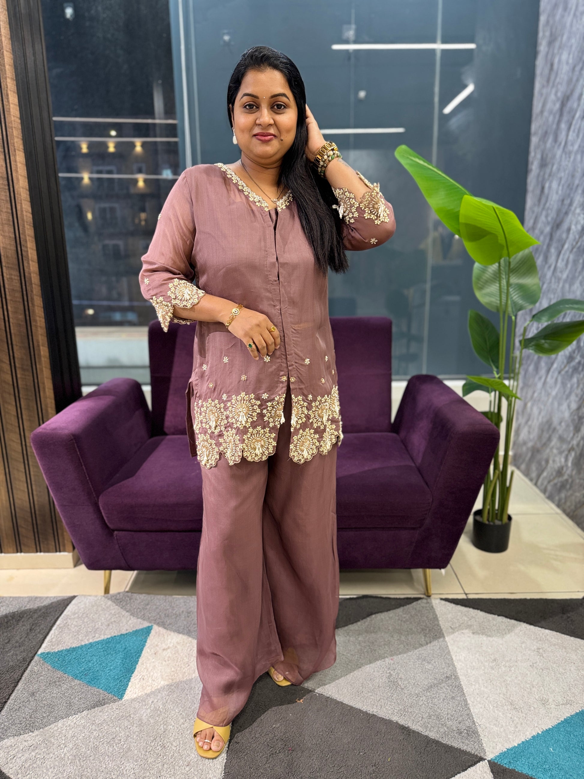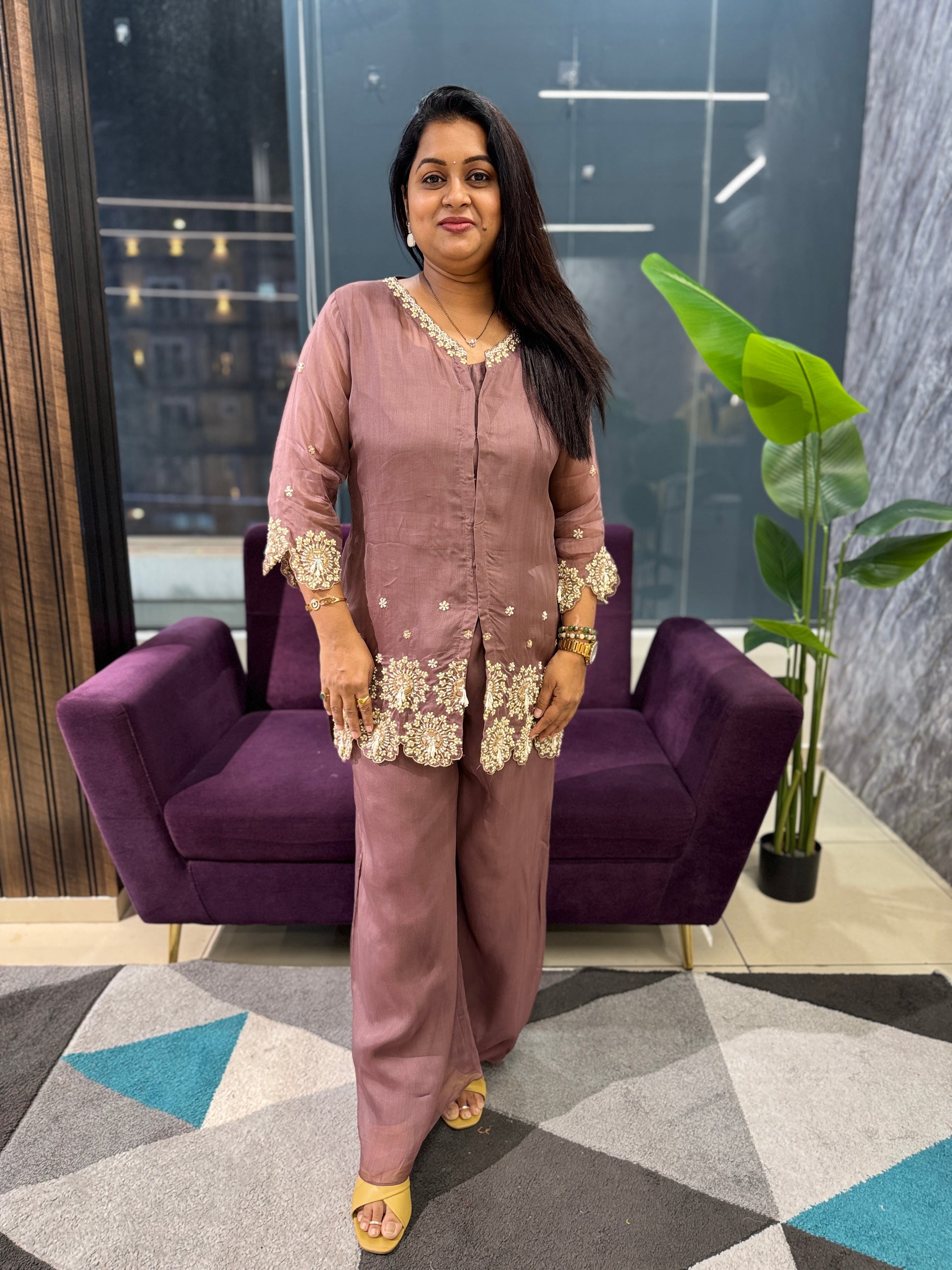Elevate your festive wardrobe with this exquisite designer cordset, meticulously crafted from luxurious viscose organza. The intricately embellished jacket features elaborate handwork that commands attention, paired with a structured bustier and gracefully flared palazzo pants for a silhouette that flatters and impresses. The three-quarter sleeves with lining provide refined coverage, while the regular fit ensures comfort throughout your celebration. Perfect for parties and festive occasions, this ensemble delivers contemporary elegance with traditional craftsmanship. Dry wash recommended to preserve the delicate embellishments and fabric quality.