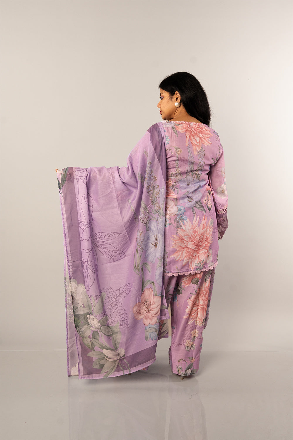 This Farshi Salwar featuring detailed organza patch work on the neck and sleeves that perfectly balances simplicity with elegance. Its 3/4th sleeves and hip-length design, enhanced by delicate lace accents, provide a refined and sophisticated look ideal for both formal and festive events. The classic silhouette ensures comfortable wear while maintaining a graceful and polished appearance.
