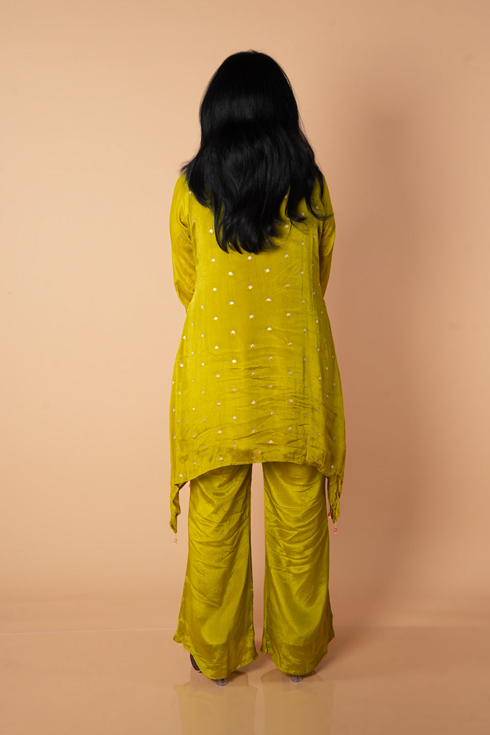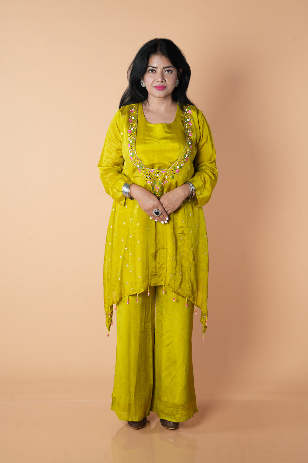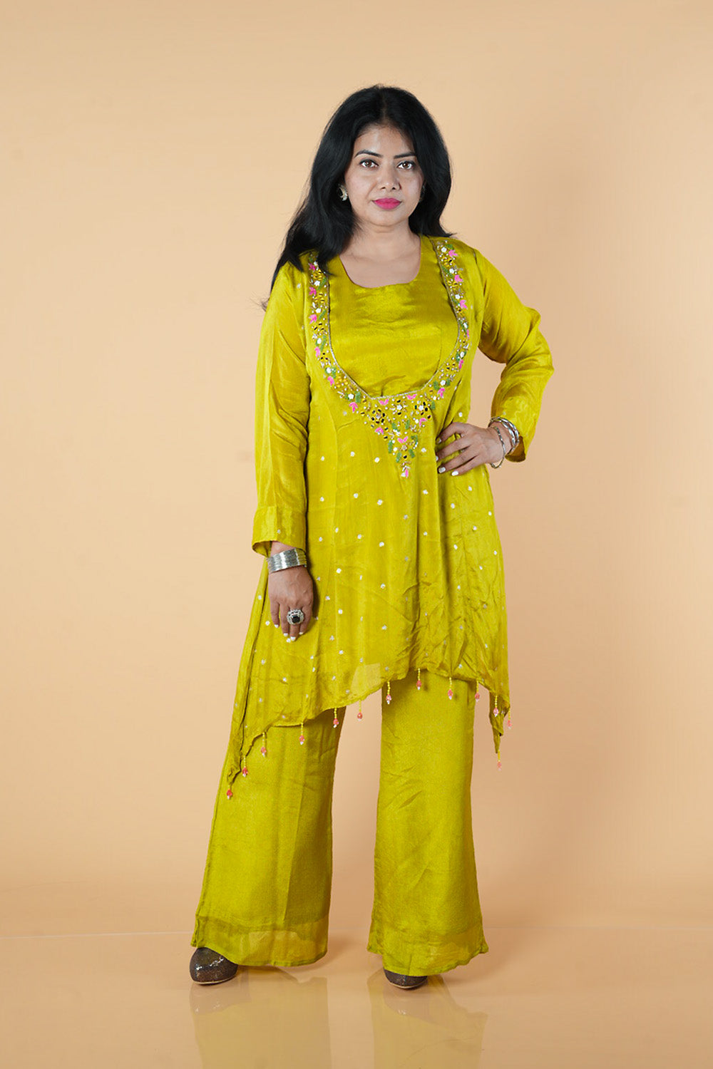 Elevate your festive wardrobe with the Green Chinnon low neck bustier cordset. Crafted from lightweight chinon fabric, this ensemble features a sophisticated low neckline and a stylish high-low silhouette that expertly balances tradition with modern design. The 3/4 sleeves and knee-length cut ensure both comfort and elegance, making it an exclusive choice for special occasions. This cordset offers a refined ethnic look that stands out with intricate detailing and a flattering fit.
