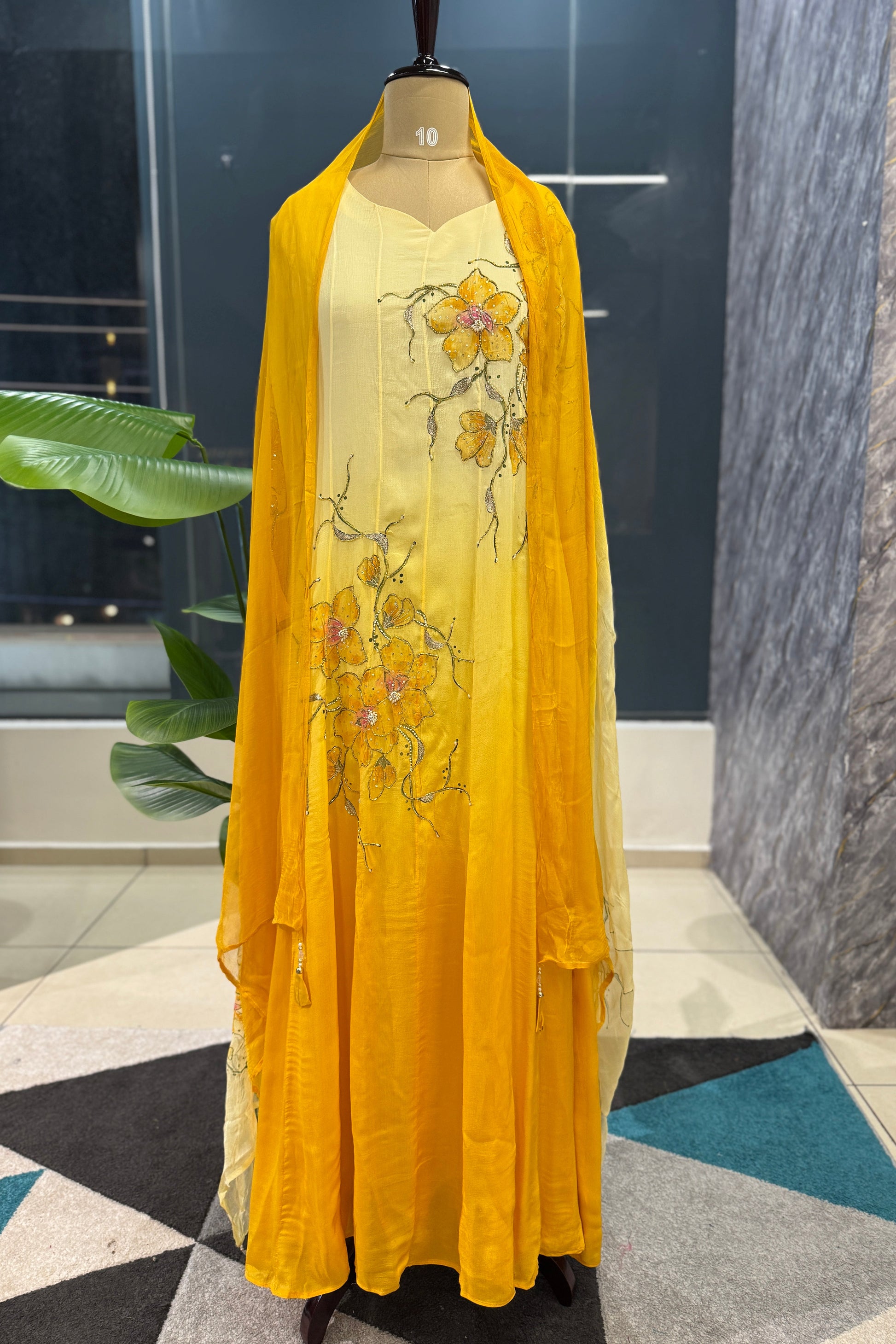 Elevate your celebration with this exclusive handpainted Chinnon Anarkali, a masterpiece of designer craftsmanship. Adorned with intricate handwork, this elegant piece embodies grace and sophistication for weddings and special occasions. Crafted from premium Chinnon fabric, it features a flattering flared silhouette with full sleeves and refined lining for comfort and structure. The handpainted details showcase artisanal excellence, making each piece uniquely yours. Perfect for parties and marriage events, this Anarkali comes with coordinating pants. Dry wash recommended to preserve the delicate handwork and vibrant colors. A timeless investment in elegance and tradition.