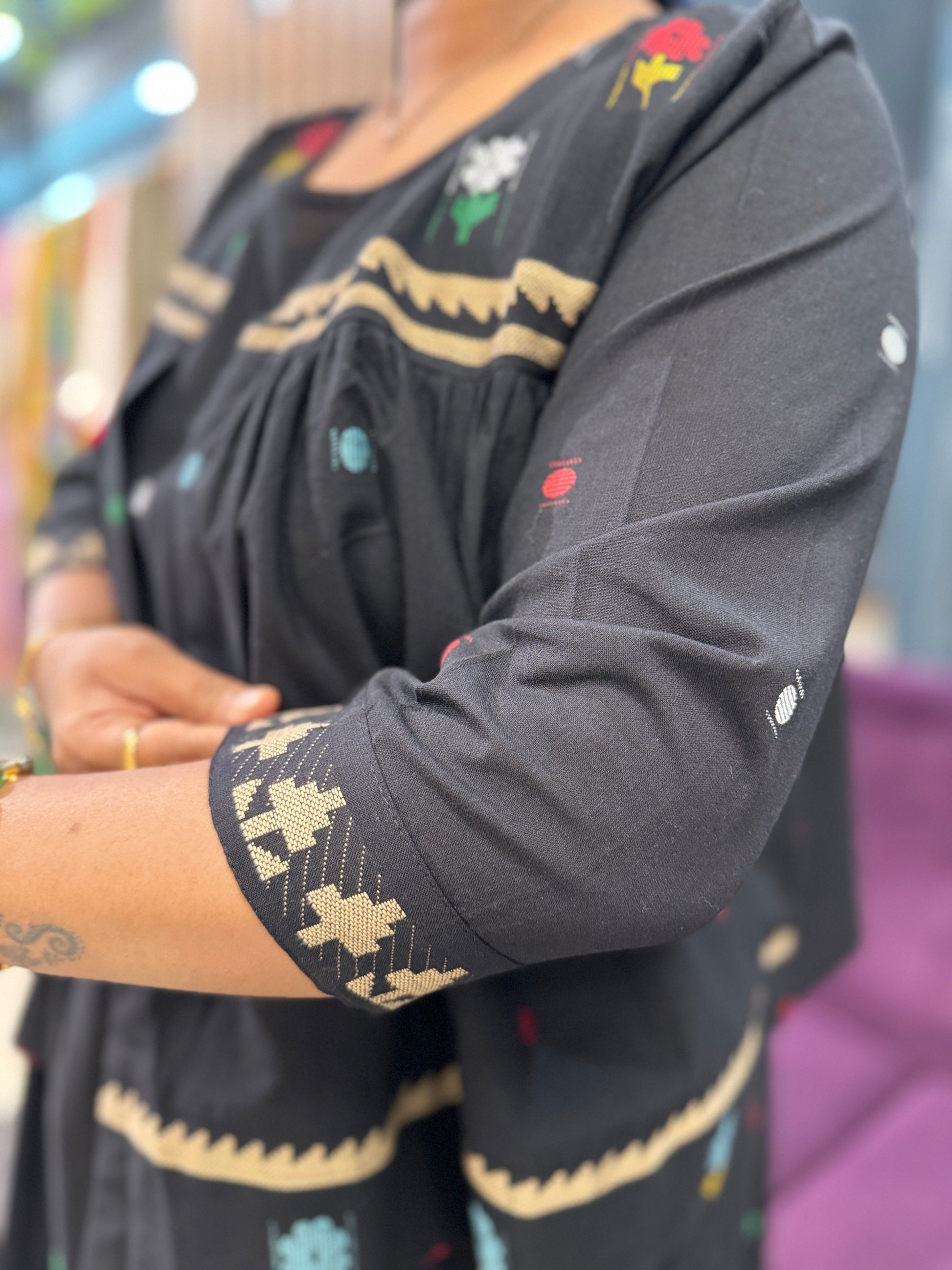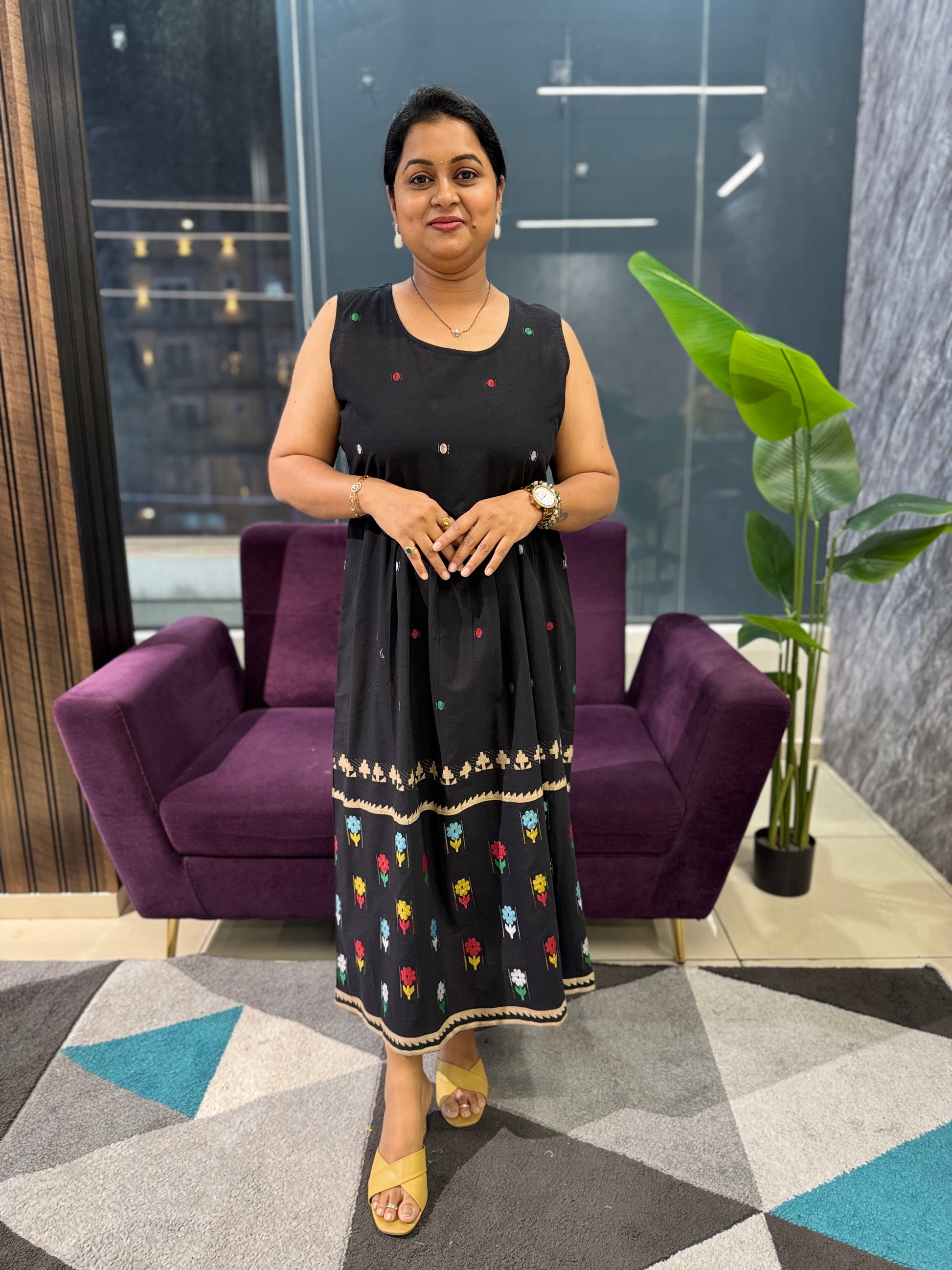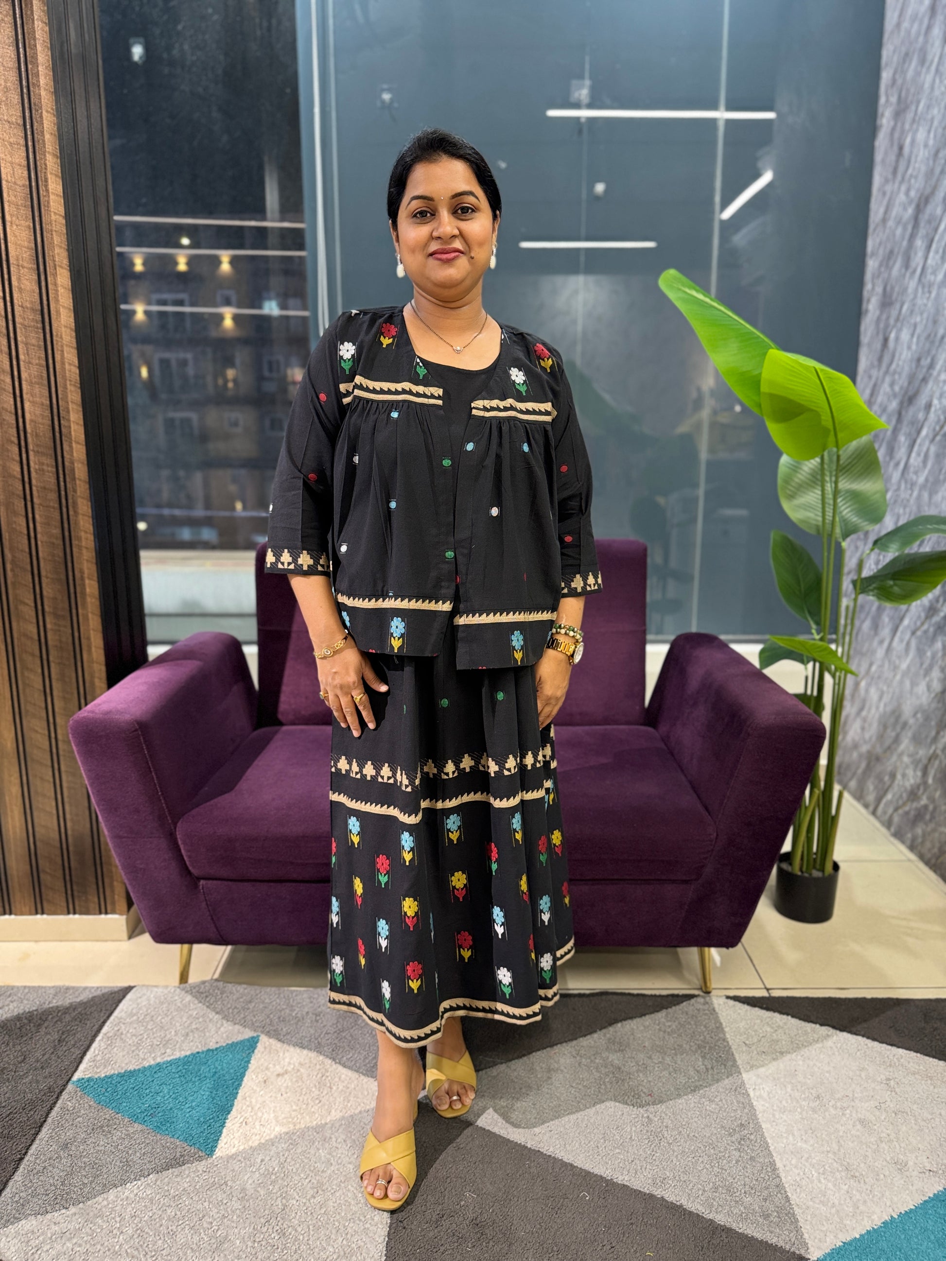 Crafted from premium cotton with intricate jamdhani weaving throughout, this elegant frock combines traditional artistry with contemporary comfort. The flared silhouette offers graceful movement, while the coordinated jacket features the same exquisite weaving pattern for a cohesive look. Three-quarter sleeves provide versatile styling for various seasons. The soft, breathable fabric ensures all-day comfort in warm climates. Hand wash recommended to preserve the delicate jamdhani detailing and fabric integrity. Perfect for casual gatherings, festive occasions, or everyday elegance.