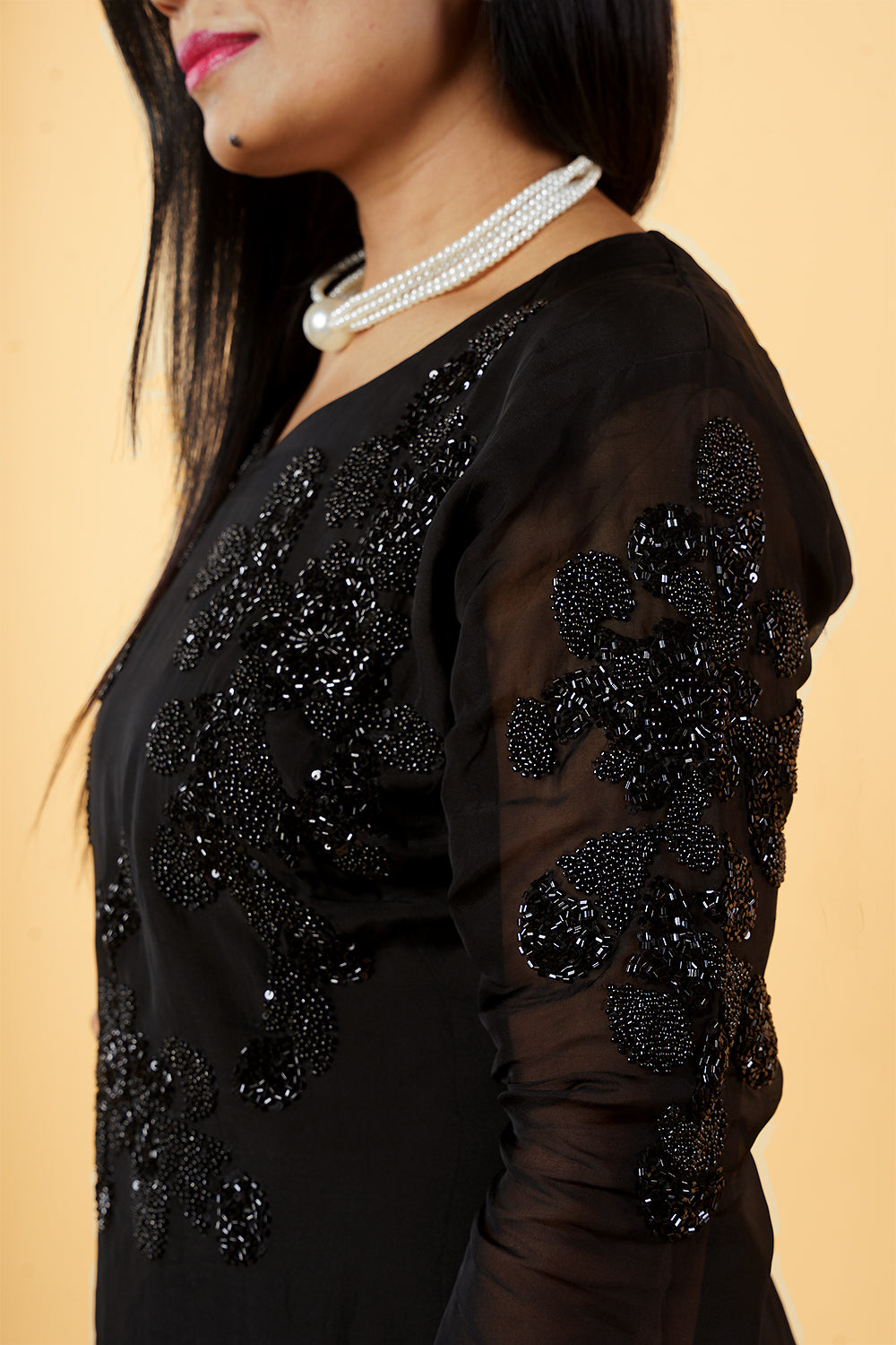 Black Crepe Designer Cordset with Handwork on on side of shirt