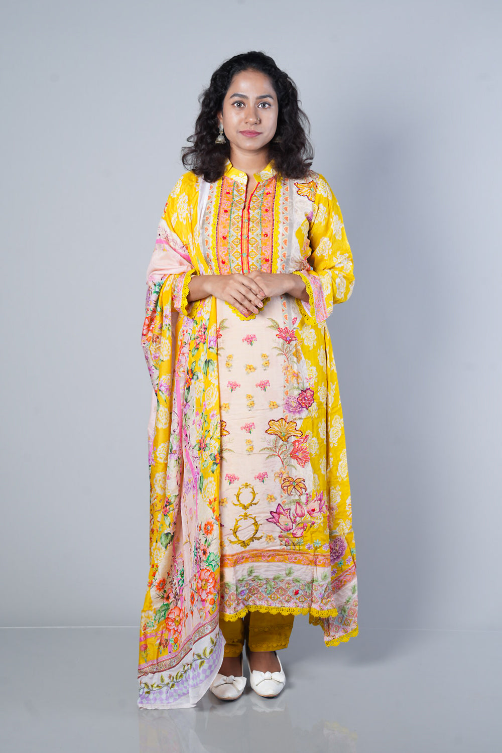 Light yellow and Cream colour kashmiri print C cut Suit set