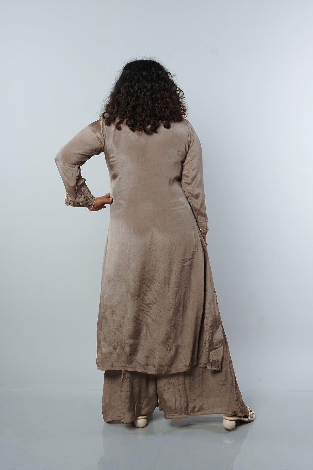 This designer suit in luxurious Chinon fabric features elegant front slits and intricate handwork on the 3/4-sleeve, reflecting exquisite traditional craftsmanship. Paired with a comfortable plazzo, it offers a perfect blend of style and ease, making it ideal for festive occasions or special events where sophistication is essential.