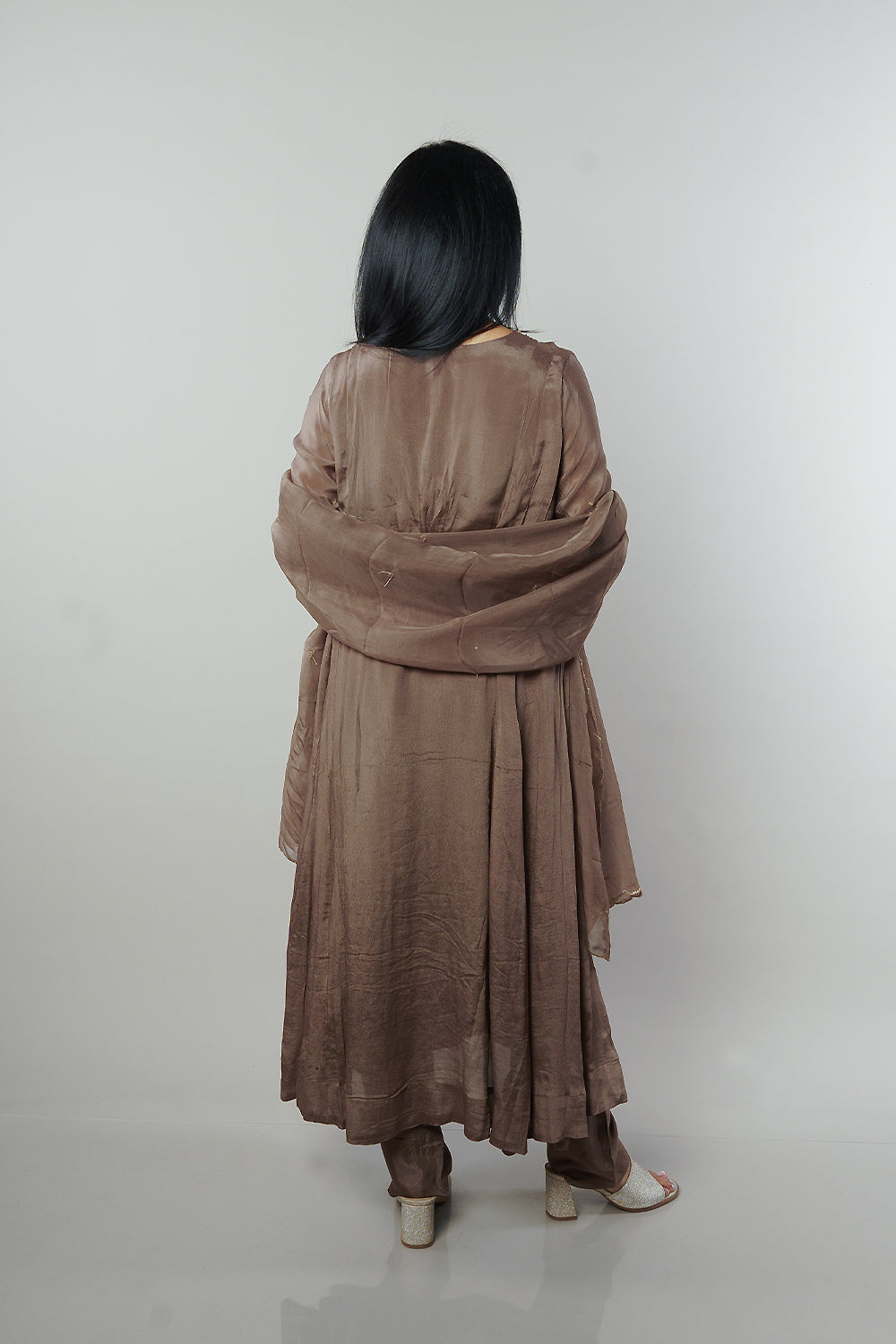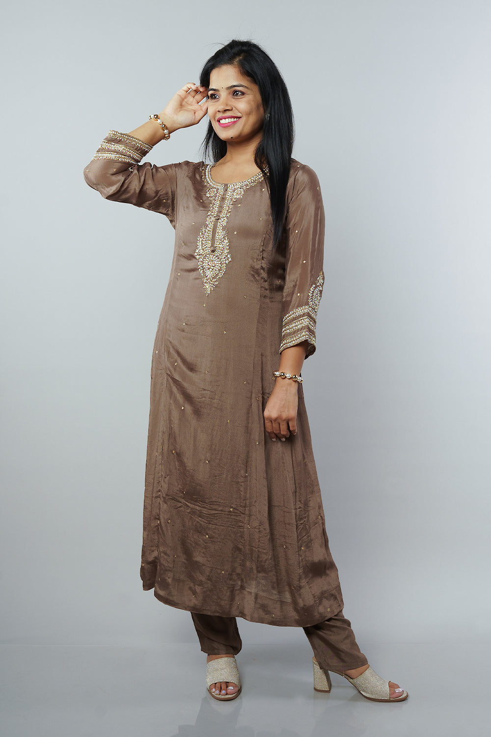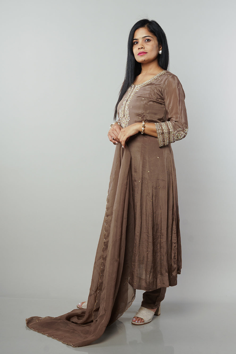This Mouse Colour Pure Chinon Handwork set is crafted from soft Chinon fabric, featuring elegant 3/4 length sleeves and a calf-length silhouette. The designer handwork on the neck and sleeves adds a touch of sophistication, while the intricately cutwork dupatta enhances the ensemble’s refined appeal. Perfect for special occasions, this set combines delicate artistry with comfortable wear, making it a standout addition to your wardrobe.