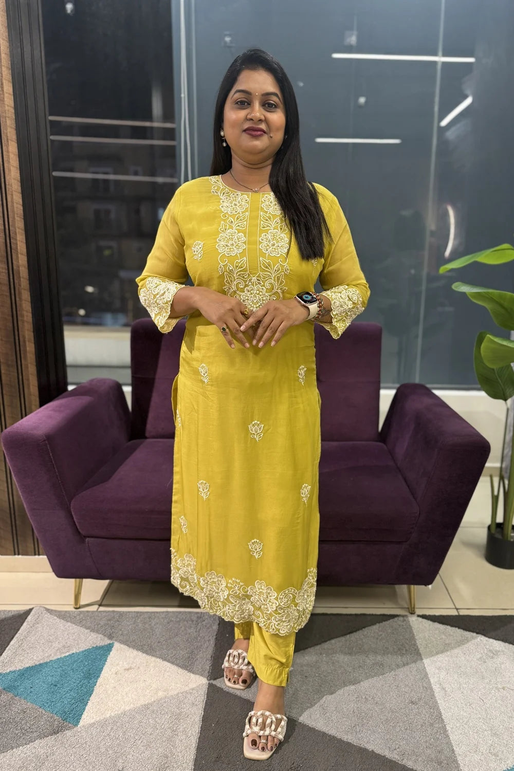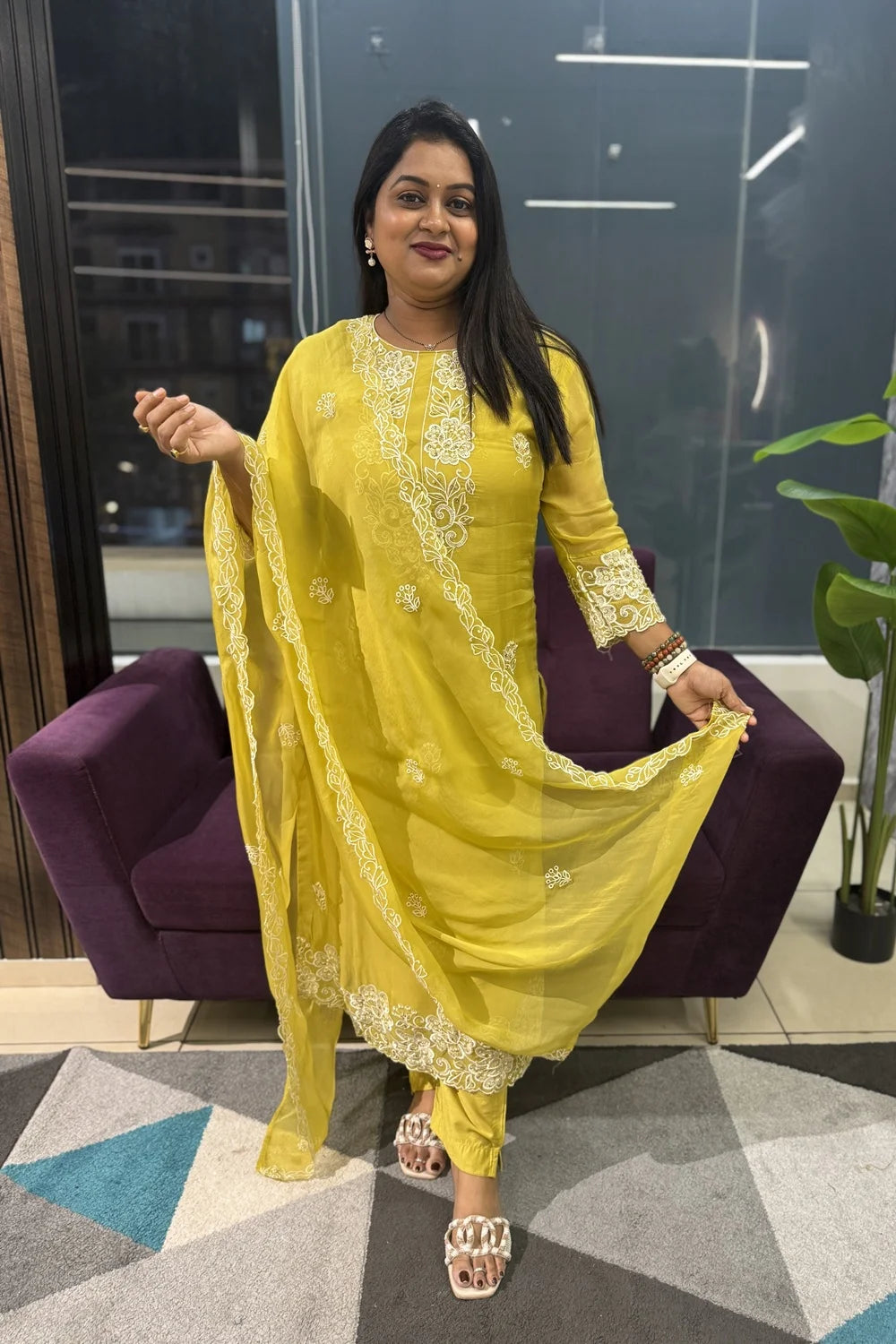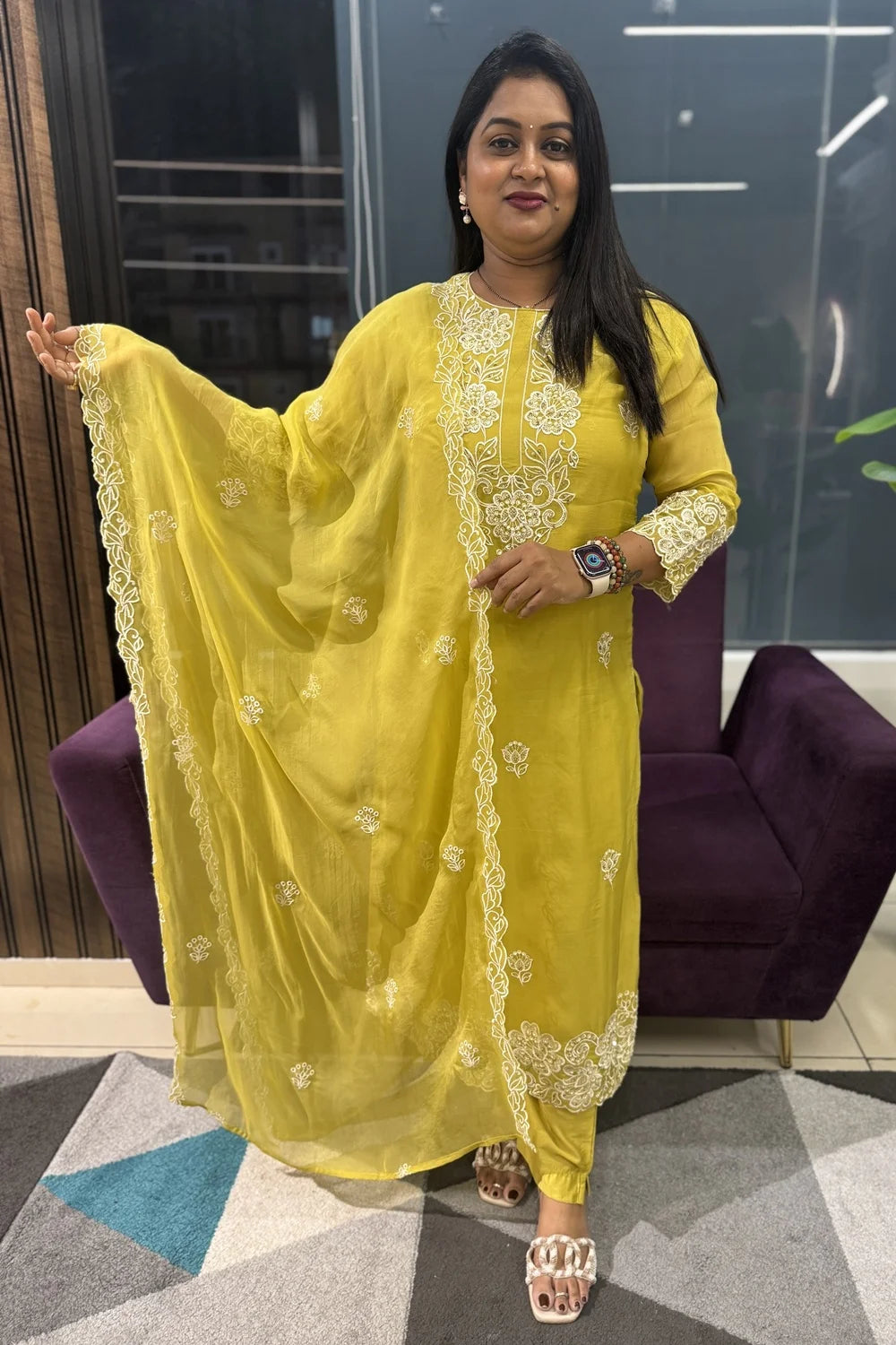 Elevate your festive wardrobe with this exquisite mustard viscose organza suit, crafted for the discerning woman. Featuring intricate embroidery detailing throughout, the ensemble includes a beautifully embellished kurta with three-quarter sleeves and coordinating straight pants. The flowing dupatta showcases premium embroidery work, making it ideal for kitty parties, weddings, and special gatherings. Constructed from premium viscose organza with internal lining for comfort and structure, this piece offers a refined silhouette with a regular fit. The sophisticated design requires dry washing to preserve its delicate embroidery and fabric quality, ensuring longevity and lasting elegance.
