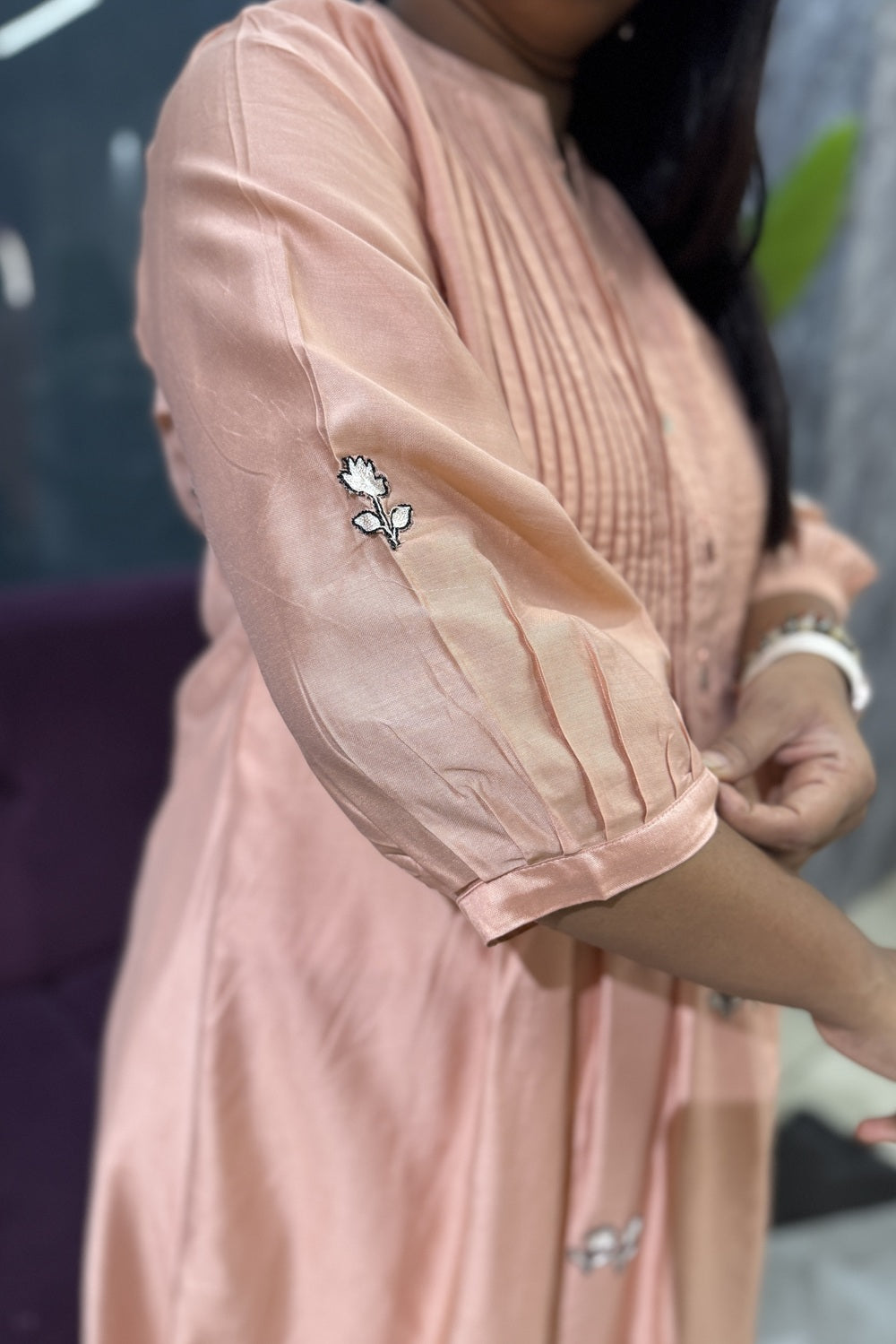 Elevate your everyday wardrobe with this sophisticated peach pleated kurti, meticulously crafted from premium Semi Chanderi fabric. Adorned with intricate embroidery and delicate coin detailing, this A-line silhouette features elegant 3/4th sleeves and a graceful flared cut. The coordinating palazzo completes the ensemble perfectly for office meetings, professional gatherings, and casual daily wear. Designed with an internal lining for comfort and durability, this piece requires gentle dry washing to maintain its refined finish. A versatile investment for the modern professional woman seeking timeless elegance.