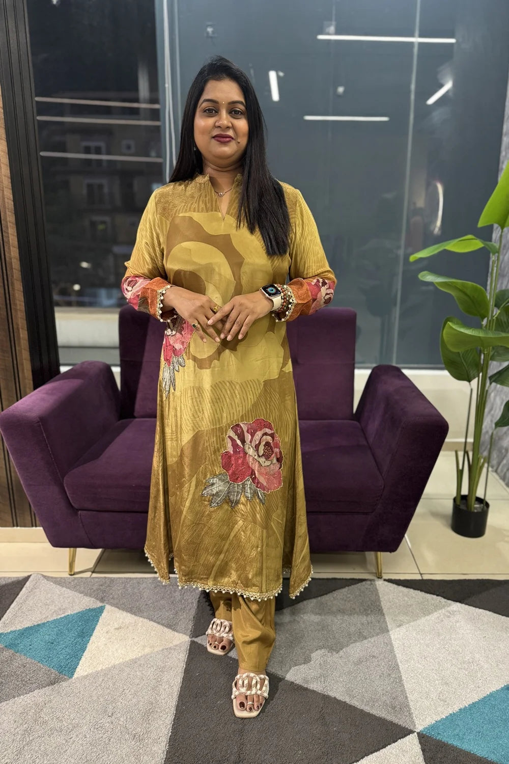 Elevate your festive wardrobe with this exquisite pure crepe kurti, crafted for celebrations and special occasions. The sophisticated mustard green hue pairs beautifully with delicate handwork detailing that adds understated elegance. Designed with a flattering A-line silhouette and three-quarter sleeves, this piece offers comfort without compromising on style. The included dupatta completes the ensemble, while the lined construction ensures durability. Pair with the coordinating pant for a polished, coordinated look. Dry wash recommended to preserve the fabric's premium quality and intricate embellishments.
