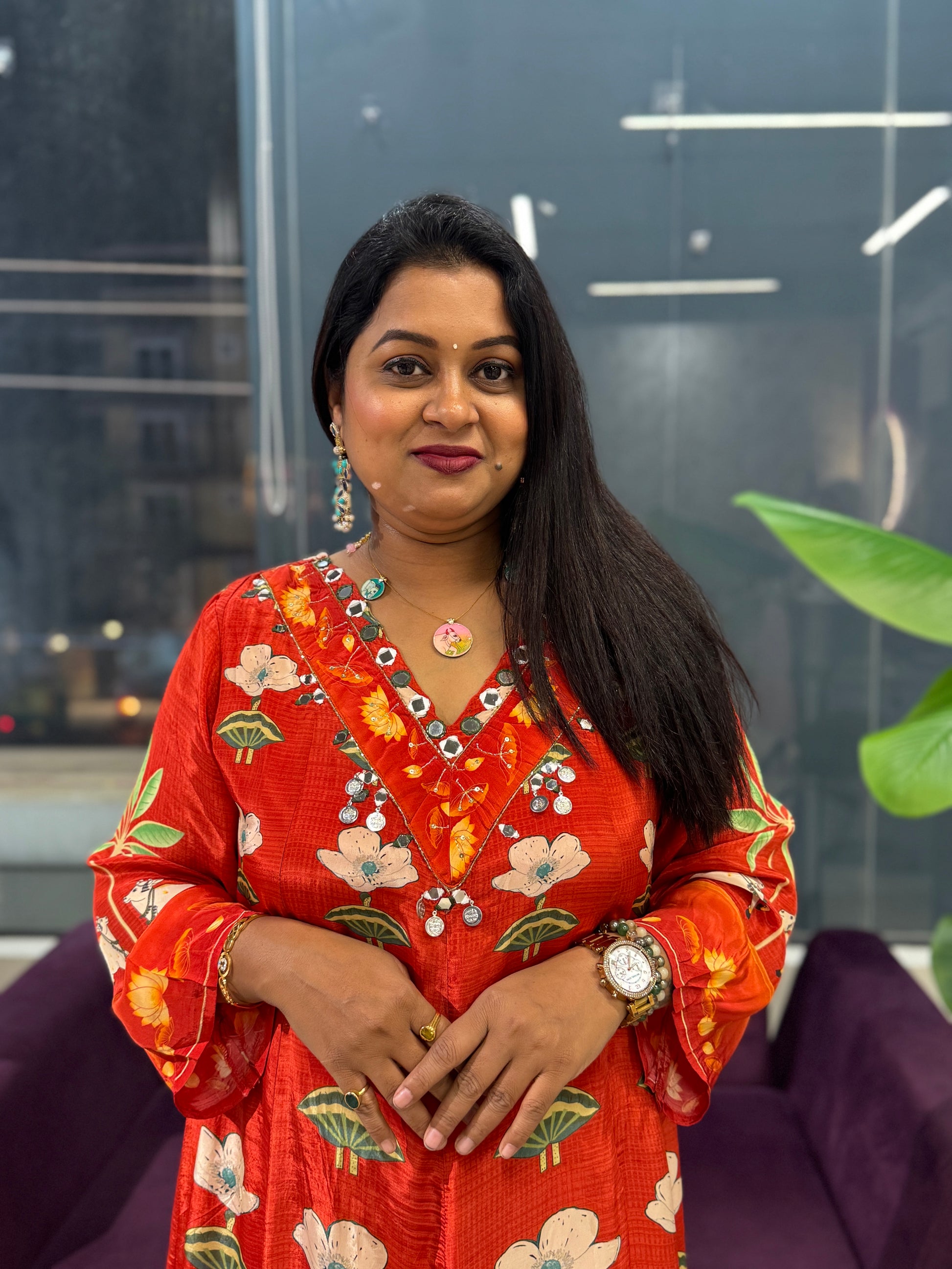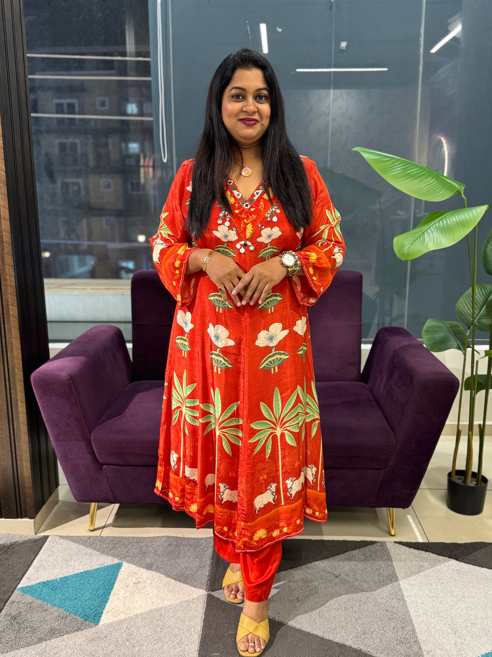 Elevate your festive wardrobe with this exquisite pichwai print suit set in warm orange tones. Crafted from premium crepe fabric, this ensemble features a gracefully flared A-line silhouette with elegant 3/4th sleeves, perfect for celebrations and special occasions. The coordinating printed floral dupatta adds authentic traditional charm, while the comfortable pant completes the sophisticated look. Ideal for parties and festive gatherings, this piece combines timeless artistry with contemporary comfort. Dry wash recommended to preserve the intricate print and fabric quality.