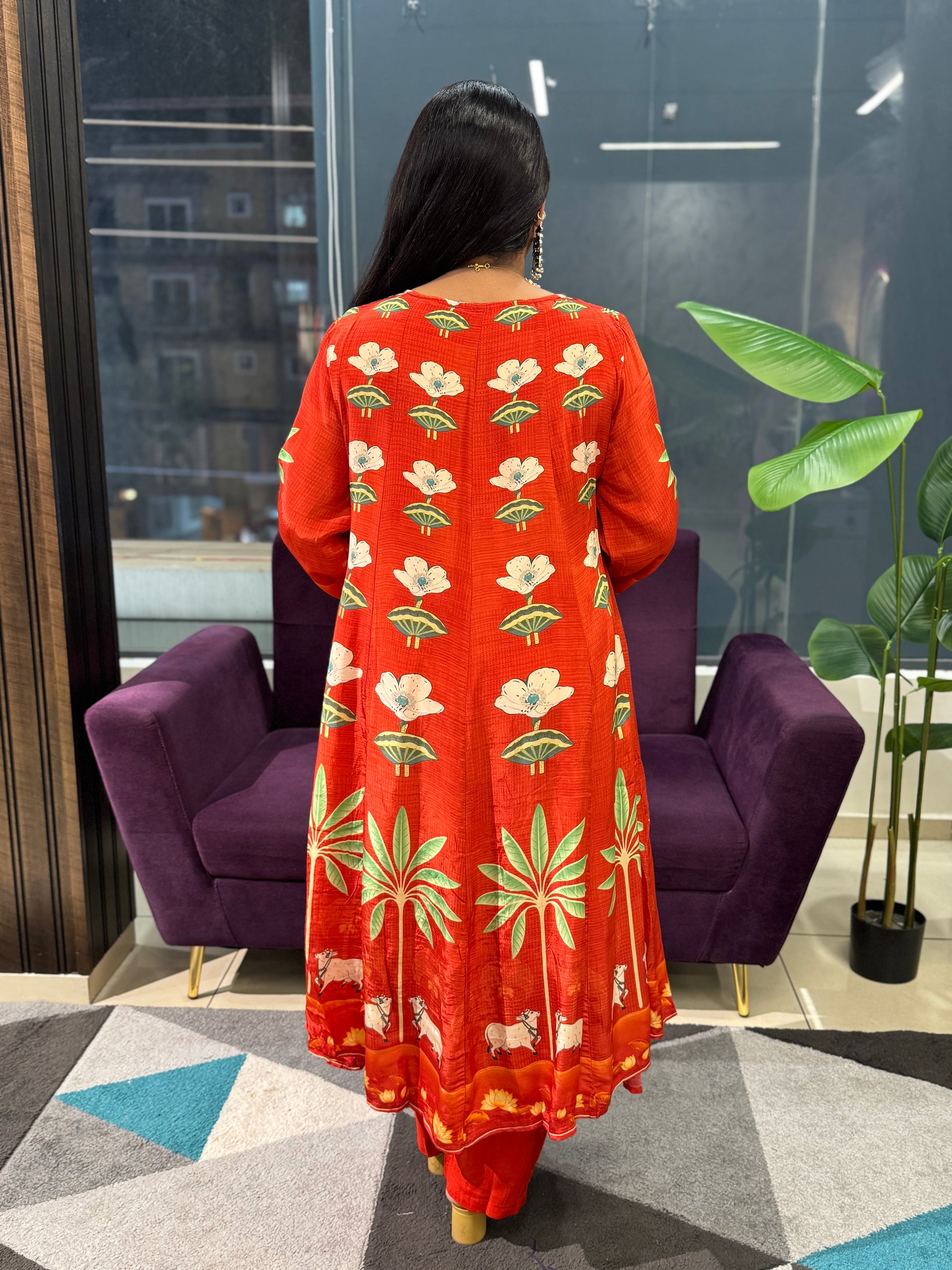 Pure Crepe pichwai print orange colour suit set