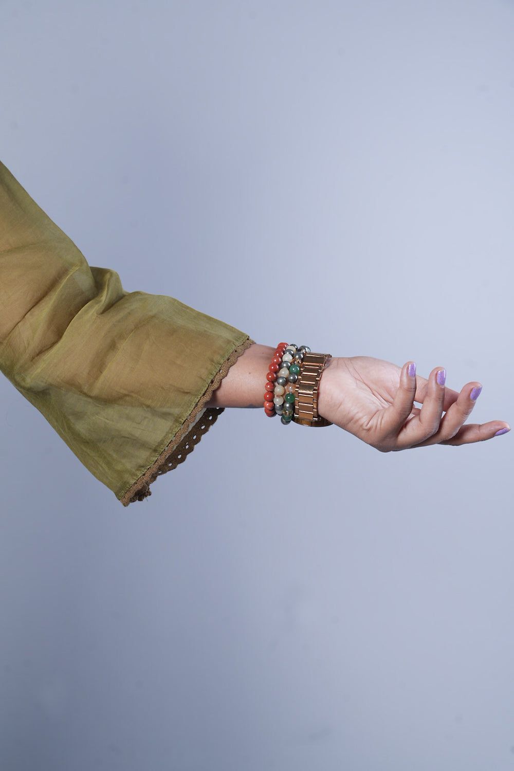This pure mulchanderi cotton suit features a rich green color adorned with silver zari sequencing on the yoke, blending printed and thread work for a refined festive vibe. With full sleeves, it’s an elegant choice for both festival celebrations and casual occasions.